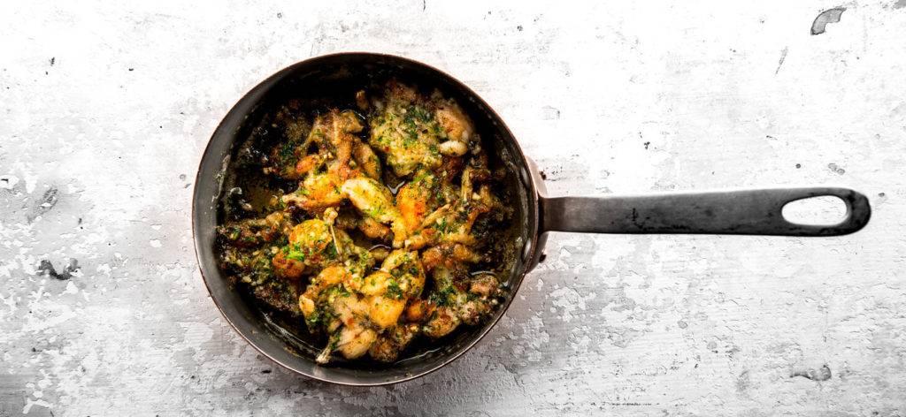 Grenouilles fraîches cuisinées au beurre ail et persil (350grs), crêpes Parmentier 39.00€